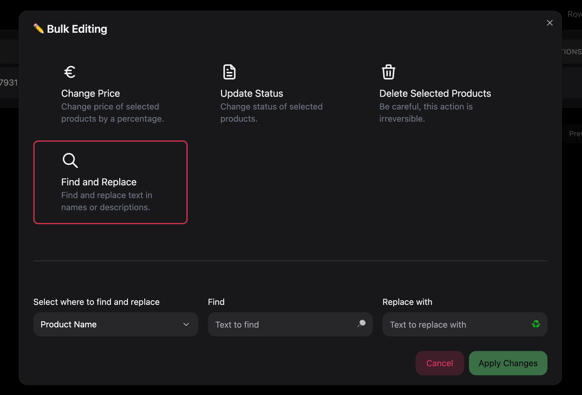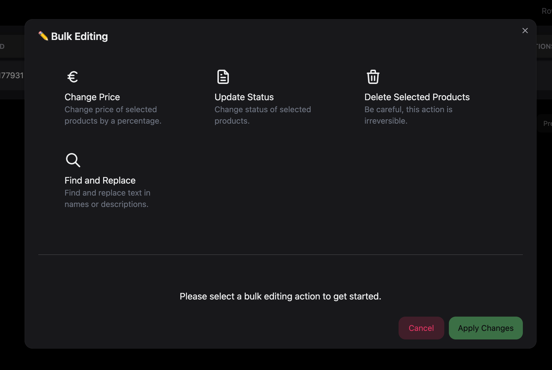 Bulk Editing is a powerful feature that allows you to make changes to multiple products simultaneously, saving time and ensuring consistency across your product catalog. Whether you need to update prices, change statuses, delete products, or perform find-and-replace operations, bulk editing streamlines these tasks into efficient, one-click operations.Bulk editing operations can be applied to selected products or all products matching your current filters. This flexibility allows you to target specific subsets of your catalog or make sweeping changes across your entire inventory.